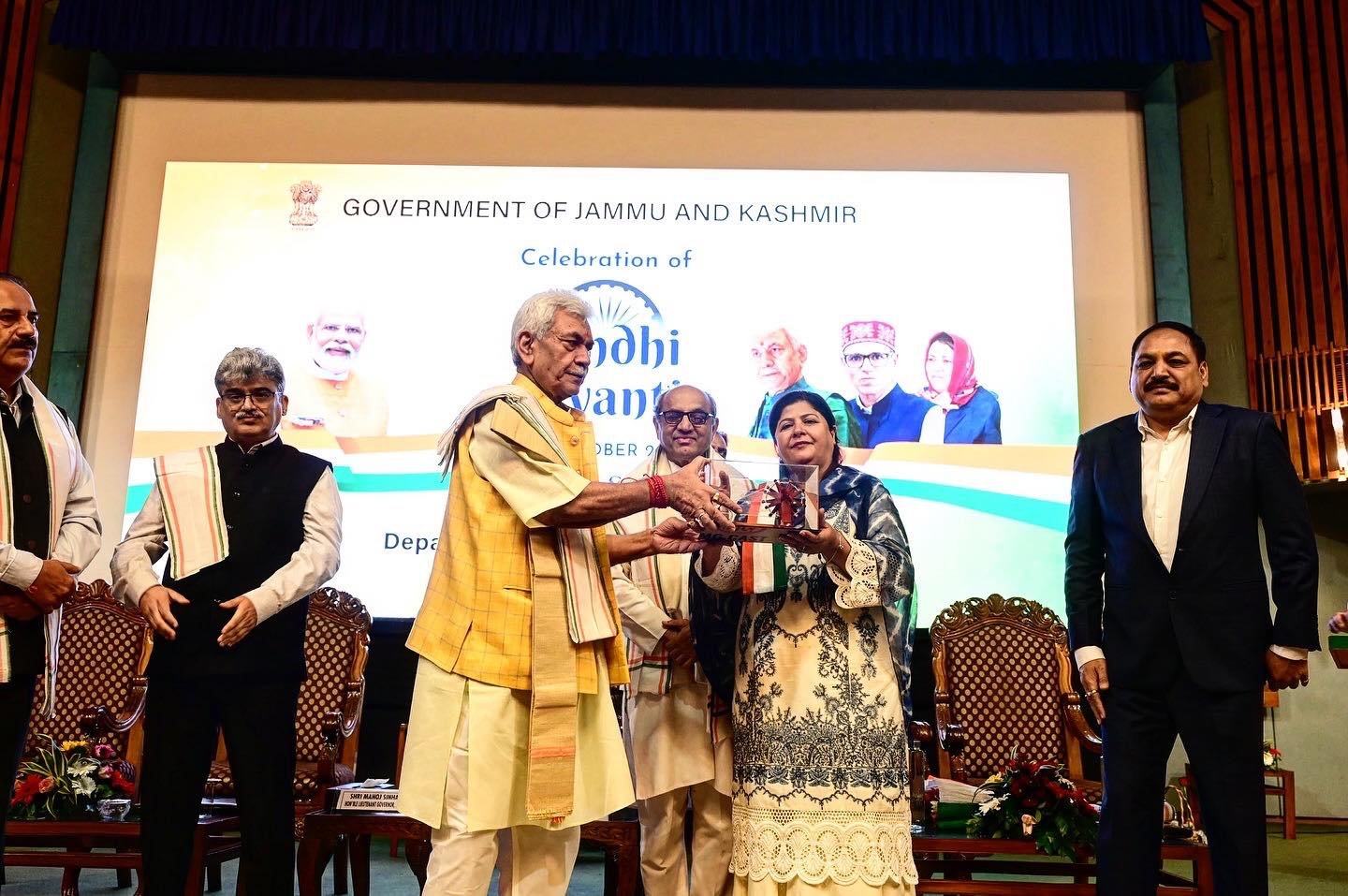 Srinagar, October 2, 2025: Dr. Mehjabeen Nabi was felicitated today by His Excellency, Lieutenant Governor Shri Manoj Sinha at the Sher-i-Kashmir International Conference Centre (SKICC) in Srinagar, during the Gandhi Jayanti celebrations. The recognition honors Dr. Nabi’s sustained and impactful contributions to community welfare and social development across Jammu & Kashmir.